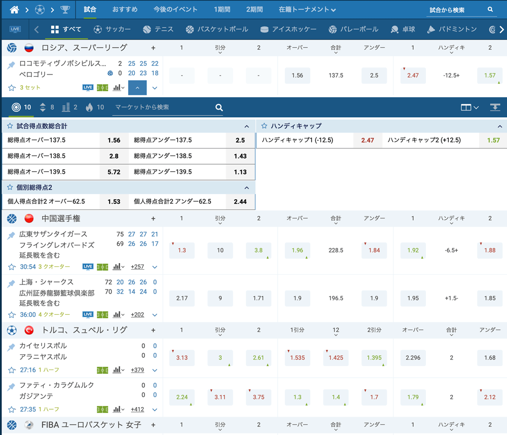 画面左には他のスポーツの試合情報が映されるので、観戦中に次に賭ける試合の選択も可能です。
